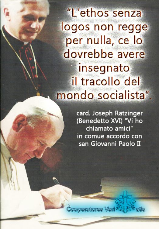 È facile formulare i grandi scopi: pace, giustizia, tutela del creato. Ma quando la giustizia si frammenta nelle giustizie e tutto ciò compare solo in un plurale che non può più essere superato, allora questi scopi diventano vuoti. Quasi inevitabilmente essi vengono confiscati dal rispettivo spirito di partito, dalle ideologie dominanti. L’ethos senza logos non regge per nulla, ce lo dovrebbe avere insegnato il tracollo del mondo socialista. Una tale critica non significa, però, in nessun modo che il nuovo modello sia da rifiutare in blocco. Sono al contrario convinto che da esso ci sia molto da imparare che possa esserci di aiuto nel momento presente.