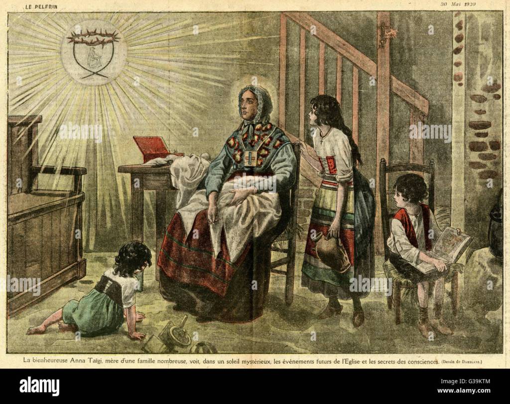 Persino nello sbrigare le faccende di casa Anna Maria cadeva più volte al giorno in dolci deliqui d’amore, estasi mistiche. Si udiva allora esclamare sorridente: “Lasciami in pace, mio Signore! Ho altro da fare. Sono una madre di famiglia, andate, ve ne prego!”. Appena ritornava in sé, sospirava di gaudio: “Mio Dio! Senza di Voi è impossibile”. Riprendeva quindi il lavoro interrotto, o si raccoglieva in preghiera, davanti all’altarino attorno al quale, la sera, radunava la famiglia per la recita del Rosario e di altre numerose preghiere, ma amava anche molto leggere per se stessa e ai figli le vite dei Santi. Anna Maria nutriva una grande devozione alla Passione del Signore e spesso, nel meditarla, il Signore stesso la inebriava del Sangue prezioso.