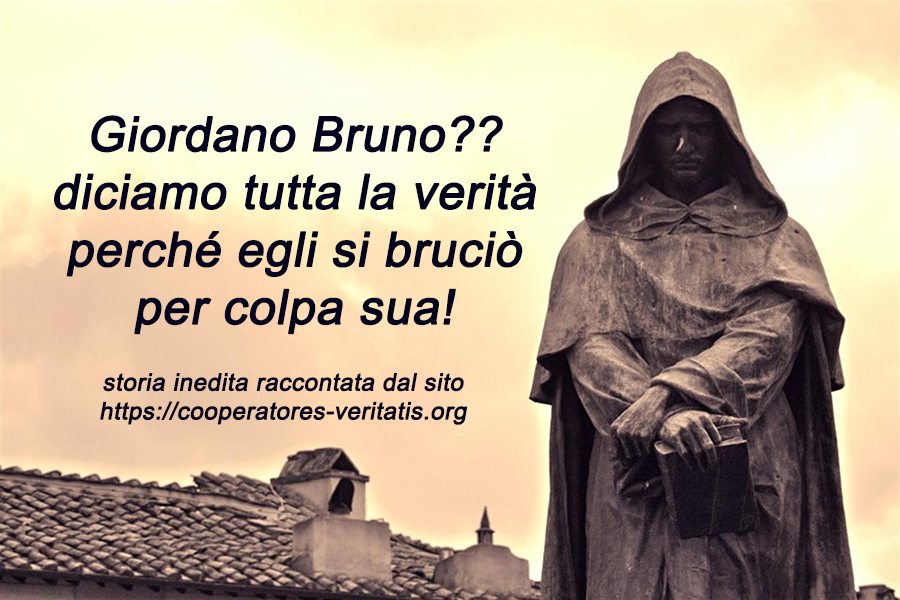Quanto è qui premesso è importante perché da qui, da questa panoramica sull’autentica lotta dell’anima verso la verità, intendiamo procedere verso l’argomento dedicato a Giordano Bruno. Non intendiamo giudicare qui il pensiero del Bruno, assai complesso ed opinabile da molti punti di vista (e perché personalmente non ne avrei la competenza), quanto piuttosto analizzare un certo fenomeno storicamente strumentalizzato che ha fatto di Giordano un mito del libero pensiero e, di conseguenza, la Chiesa quale matrigna oscurantista.