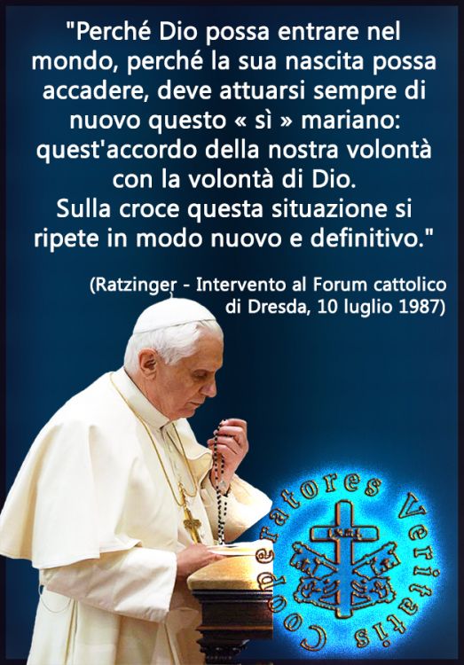 7. Sabato = Benedetta Tu che hai creduto — «Benedetta tu, che hai creduto! »: Elisabetta saluta così Maria. L’atto di fede con cui ella è divenuta la porta attraverso la quale Dio entra nel mondo e fa spazio così alla speranza di Colui che è il « Benedetto » in lei è un atto di obbedienza: «Accada di me secondo la tua parola», in tutto il mio essere io sono disponibile a servire la tua volontà. In Maria, «fede» significa mettersi a disposizione, dire di sì. Nell’atto della fede ella offre a Dio la sua personale esistenza come « luogo » in cui Dio stesso può operare. La fede non è un atteggiamento accanto ad altri, bensì è il discorso di tutto quanto il proprio essere, in atteggiamento di apertura alla volontà di Dio e così alla volontà di Colui che è la Verità e l’Amore. Nella sua enciclica mariana, Giovanni Paolo II ha spiegato in un modo meravigliosamente profondo questa fede di Maria […]. Da quest’enciclica mi permetto di cogliere due aspetti, che possono condurci a una più profonda comprensione della sua fede, e di qui a una comprensione più generale della fede come obbedienza. In primo luogo il riferimento al salmo 40 (vv. 6-8), nel quale la lettera agli Ebrei vede espresso l’atto di fondamentale obbedienza di Gesù al Padre che si compie nell’incarnazione e sulla croce: «Non hai voluto sacrificio né oblazione, e tu pure mi hai dato la vita… Ecco, io vengo, o Signore, per fare la tua volontà». Pronunciando il suo sì alla nascita dal suo grembo del Figlio di Dio, per opera dello Spirito Santo, Maria mette a disposizione il suo corpo, tutto il suo essere come «luogo» in cui Dio medesimo è all’opera. In questa sua affermazione la volontà di Maria viene a coincidere con quella del Figlio. È nella consonanza di questo «Sì, tu mi hai dato la vita» che l’incarnazione e la nascita di Dio divengono possibili. Perché Dio possa entrare nel mondo, perché la sua nascita possa accadere, deve attuarsi sempre di nuovo questo « sì » mariano: quest’accordo della nostra volontà con la volontà di Dio. Sulla croce questa situazione si ripete in modo nuovo e definitivo. Non c’è più nulla dello splendore di gloria del padre Davide, di cui aveva parlato la promessa fatta a Israele. La fede si trova gettata in una condizione di totale oscurità, come è stato per Abramo. « Tu mi hai dato la vita: ecco, io vengo », ora quest’espressione di disponibilità viene presa totalmente sul serio: proprio l’oscurità in cui Maria si trova è la piena comunione di volontà con il Figlio. La fede è comunione nella croce, e sulla croce soltanto essa si realizza a pieno: il luogo dell’ultima disperazione è la vera e propria sorgente da cui sgorga la redenzione. Mi pare che per parte nostra sia necessario imparare nuovamente, e a fondo, il significato di questa centralità religiosa della croce. Essa può esserci apparsa come qualcosa di eccessivamente « passivo » e di troppo «pessimistico» o «sentimentale»; ma se non facciamo esercizio della croce, come potremo reggerla nel momento in cui ci sarà caricata sulle spalle? Un amico che per anni è stato costretto alla dialisi renale e che ha potuto sperimentare come, passo per passo, la vita gli è stata sottratta di mano, mi ha raccontato una volta che egli da bambino aveva amato in modo particolare la Via crucis e che poi, anche più in là negli anni, l’aveva pregata di buon grado e con partecipazione sincera. Quando poi aveva appreso la terribile diagnosi, era rimasto dapprima come stordito, ma poi improvvisamente si era reso conto: ora si faceva «serio» quel «sì», che egli aveva sempre recitato nella preghiera, «ora anche tu potevi davvero incamminarti con Gesù, e esser da lui incorporato alla sua Via crucis». In questo modo egli aveva ritrovato quella serenità che fino all’ultimo si è sprigionata da lui e ci ha permesso di contemplare lo spettacolo luminoso della sua fede. Vorrei dunque concludere con le parole di Romano Guardini: noi dobbiamo di nuovo imparare « quale forza liberatrice vi è nel superamento di sé; come la sofferenza, intimamente accettata e accolta, trasforma l’uomo; e come ogni crescita in tutto ciò che è essenziale non dipende solo dall’impegno e dal lavoro, ma anche dal sacrificio liberamente offerto». (Intervento al Forum cattolico di Dresda, 10 luglio 1987)