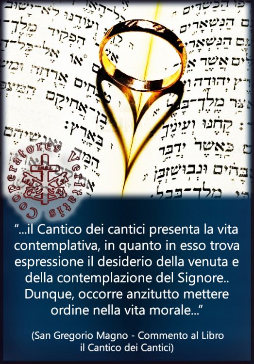 In questo Anno dedicato alla Vita Consacrata, ma anche per noi Laici impegnati nelle famiglie e nel mondo, così come nei vari Terz’Ordini, giunge davvero a proposito un bellissimo paragrafo di San Gregorio Magno dal Commento al Libro del Cantico dei cantici. In questo passo, che vi offriamo in audio e con il testo scritto in italiano e in latino, il santo Pontefice ci aiuta intanto a come predisporci per una lettura edificante e fruttuosa del testo, poi spiega davvero in modo semplice la visione escatologica della Chiesa quale Sposa e del Signore in quanto Sposo, le promesse e la fedeltà del Signore, così quale è il nostro ruolo e il nostro compito di Battezzati. Ci aiuta a comprendere il valore dei due Sacramenti quali il Matrimonio e l’Ordinazione sacra i quali, lungi dall’essere contrapposti o in lotta fra loro, bensì diversi fra loro – non separati – ma uniti in un unico scopo: vivere in pienezza l’unione sponsale di Dio con la Chiesa sua Sposa e noi, membra unite dal Battesimo e, da questa Sposa, rigenerate in Cristo, per Cristo e con Cristo, il degnissimo ed amabile Sposo.