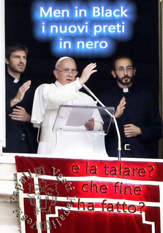 L’immagine riporta l’invito che il Papa ha fatto stamani, di benedire con lui la folla radunata in piazza San Pietro per il consueto incontro mariano, a due dei diciannove Sacerdoti ordinati nella mattina in Basilica. Ci teniamo a sottolineare che l’articolo non ce l’ha con i neo Ordinati, anzi, ci stringiamo a loro con commossa e filiale letizia, augurando ogni Bene ed un fruttuoso Ministero. Abbiamo solo colto l’occasione – in se anche simpatica la foto – per approfondire una sorta di “caccia al tesoro”, il tesoro è la talare, è scomparsa, qualcuno l’ha rubata, o qualcosa l’ha fatta sparire: dove è finita la talare?