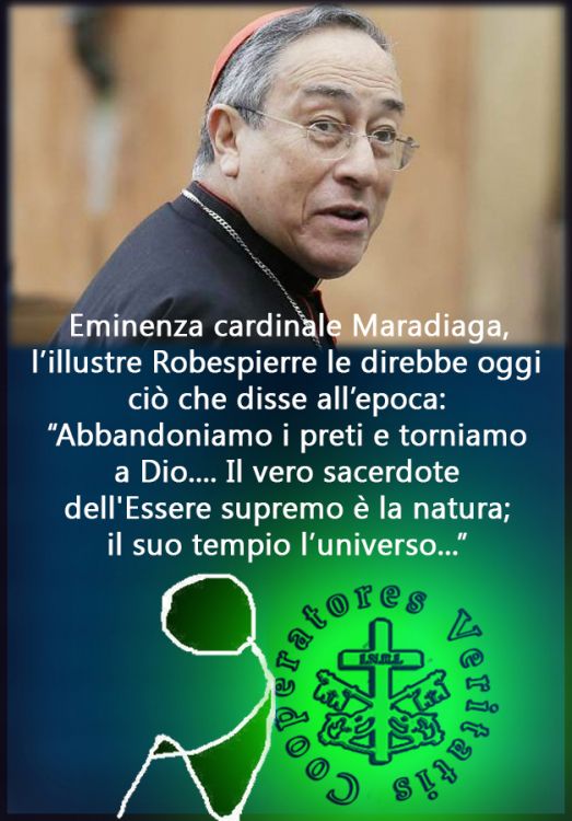 Perciò, Eminenza cardinale Maradiaga, non s’infili in questi vicoli ciechi della storia, la Chiesa cammina a testa alta grazie ai suoi tanti martiri e alle dure persecuzioni subite. Se per lei la Rivoluzione francese fu “autenticamente umana”, non scandalizziamoci se si arriva a dire oggi che Nostro Signore Gesù Cristo sulla croce non c’è arrivato proprio, e se ci fosse mai arrivato, fu una esecuzione da nulla; che magari la tomba non era vuota; o che l’eresia ariana non era una eresia, ma solo un punto di vista cattolico diverso da intendere l’identità del Cristo e di conseguenza arrivare ad affermare che le eresie non esistono.