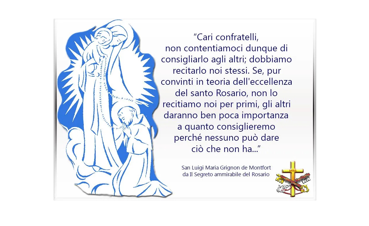 “A Lourdes Ella Stessa teneva tra le mani un bel Rosario, mentre Bernadette recitava l’Ave Maria. A Fatima, in ciascuna delle apparizioni, la Madonna raccomandava la recita del Rosario, specialmente durante l’ultima apparizione, quando presentò Se Stessa come “la Signora del Rosario”.