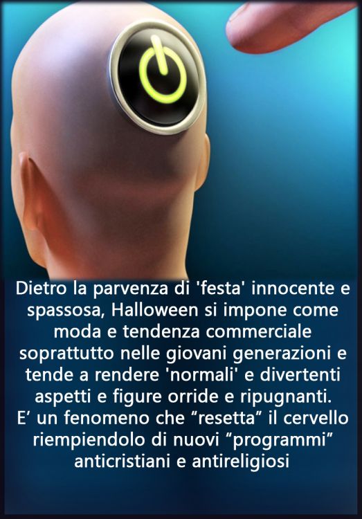 Halloween di oggi, NON è affatto quella tradizione antica attraverso la quale si giustifica la sua innocente goliardia. E’ un fenomeno che “resetta” il cervello riempiendolo di nuovi “programmi” anticristiani e antireligiosi.