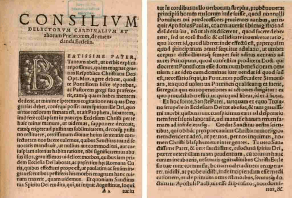 Si tratta della traduzione italiana di uno stralcio dalle prime due pagine del Consilivm delectorvm cardinalivm et aliorvm praelatorum, de emendanda Ecclesia (Romae, apud Antonium Bladum, 1538). È il documento redatto dall’apposita commissione Consilium de emendanda Ecclesia nominata nel 1536 da Papa Paolo III per analizzare la situazione della Chiesa del tempo, per riflettere sugli abusi e sulla corruzione, ed elaborare proposte di riforma. La commissione era presieduta dal Cardinale Gasparo Contarini e ne fecero parte: Cardinale Giovanni Pietro Carafa (poi Papa Paolo IV), Cardinale Jacopo Sadoleto, Cardinale Reginald Pole, Arcivescovo Federigo Fregoso (poi creato cardinale nel 1539 da Papa Paolo III), Arcivescovo Girolamo Aleandro (nominato cardinale in pectore nel 1536 e poi pubblicato cardinale nel 1539 da Papa Paolo III), Vescovo Gian Matteo Giberti, Abate Gregorio Cortese (poi creato cardinale nel 1541 di Papa Paolo III), Padre Tommaso Badia (poi creato cardinale nel 1542 dal Papa Paolo III). Il testo venne presentato a Paolo III nel concistoro del 9 marzo 1537.