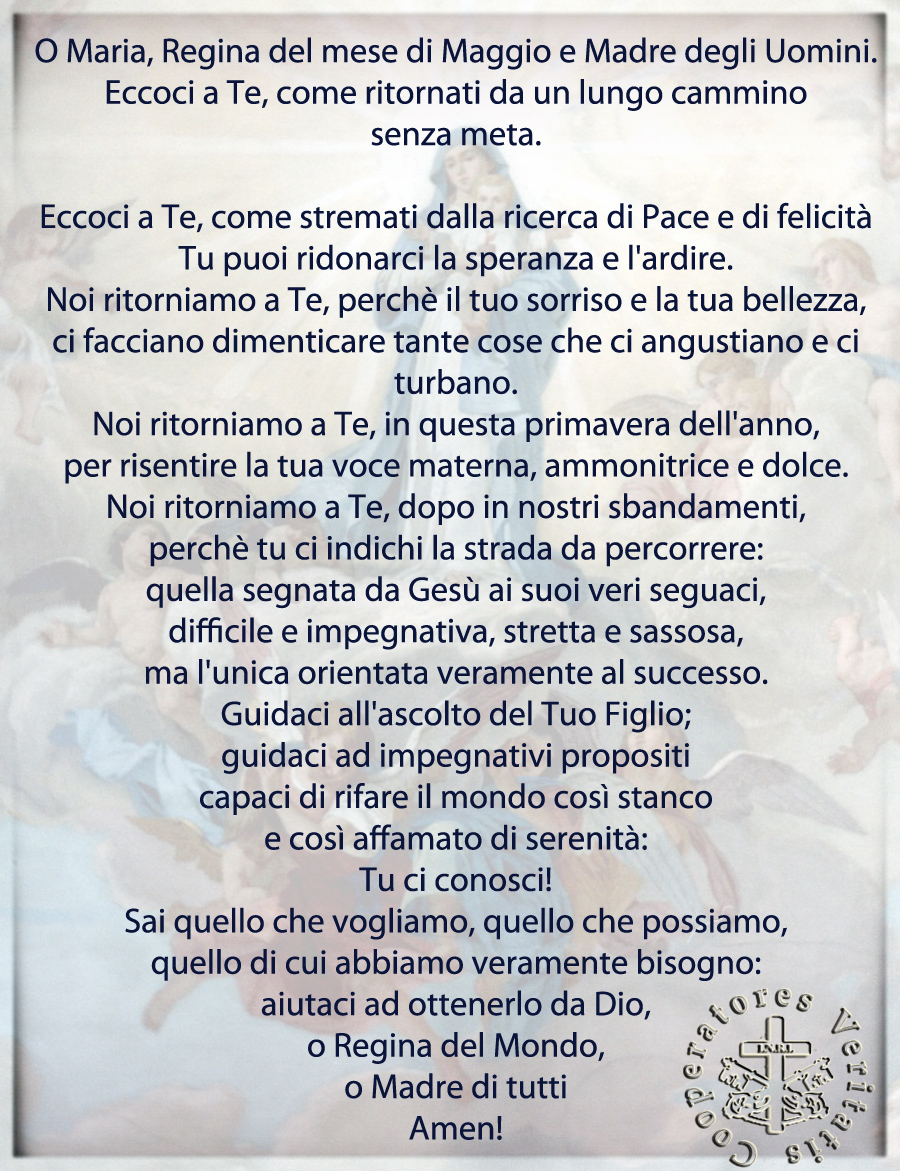Preghiamo. – Infondi nel nostro spirito la tua grazia, o Padre: Tu, che all’annunzio dell’Angelo ci hai rivelato l’incarnazione del Tuo Figlio, per la sua passione e la sua croce guidaci alla gloria della risurrezione.