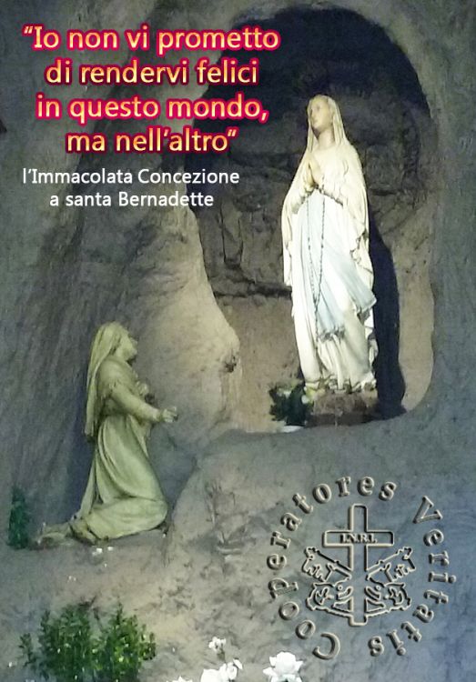 Durante le numerose apparizioni la Vergine disse a Lourdes alla giovane Bernadette: “Io non vi prometto di rendervi felici in questo mondo, ma nell’altro” e svelò a Bernadette, mostrandosi in atteggiamento simile a quello riportato nella Medaglia Miracolosa, di essere “l’Immacolata Concezione”. L’Immacolata propose a Bernadette un cammino di conversione, per giungere alla vera felicità che più conta, lo stesso che invita a percorrere ancora oggi ad ogni pellegrino che raggiunge la grotta di Massabielle. Lourdes è proprio questo, un invito alla conversione, un appello a cambiare la rotta! per raggiungere la vera felicità.