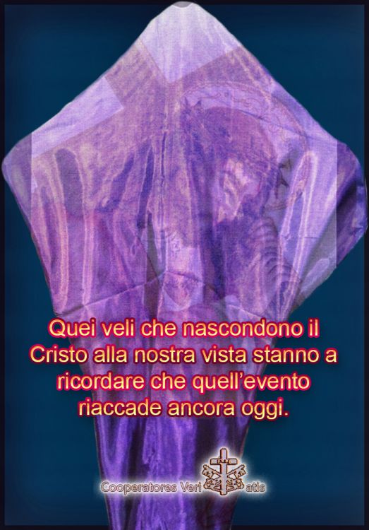 Quei veli che nascondono il Cristo alla nostra vista stanno a ricordare che quell’evento riaccade ancora oggi. Che anche noi siamo “tra gli uccisori di Cristo”, tra quelli che lo volevano gettare dal precipizio della città di Nazaret, o lapidarlo nel tempio di Gerusalemme. Si tratta, dunque, di un segno efficace che aiuta a meditare, riflettere e pregare sulla tragicità della condizione umana senza la presenza del Dio redentore.