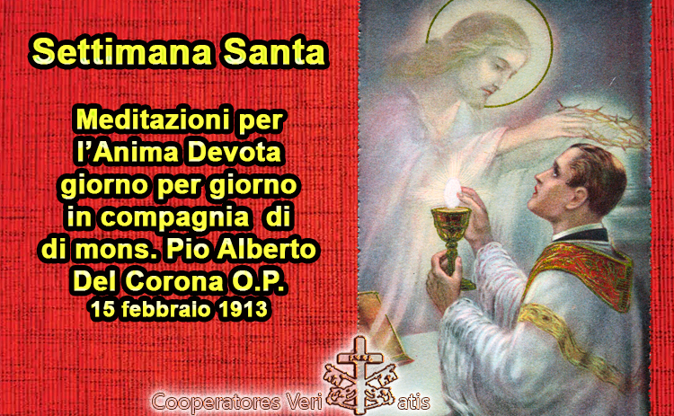 Eccoci al Mercoledì Santo; tutte le fibre del cuore cristiano sono in movimento e l’anima è un tremito. Comincia l’Uffizio delle tenebre: le Lamentazioni di Geremia provocano a piangere; e David con mesti ritmi canta gli obbrobri e l’umiliazione di Gesù venuto nell’alto mare dè dolori umani.