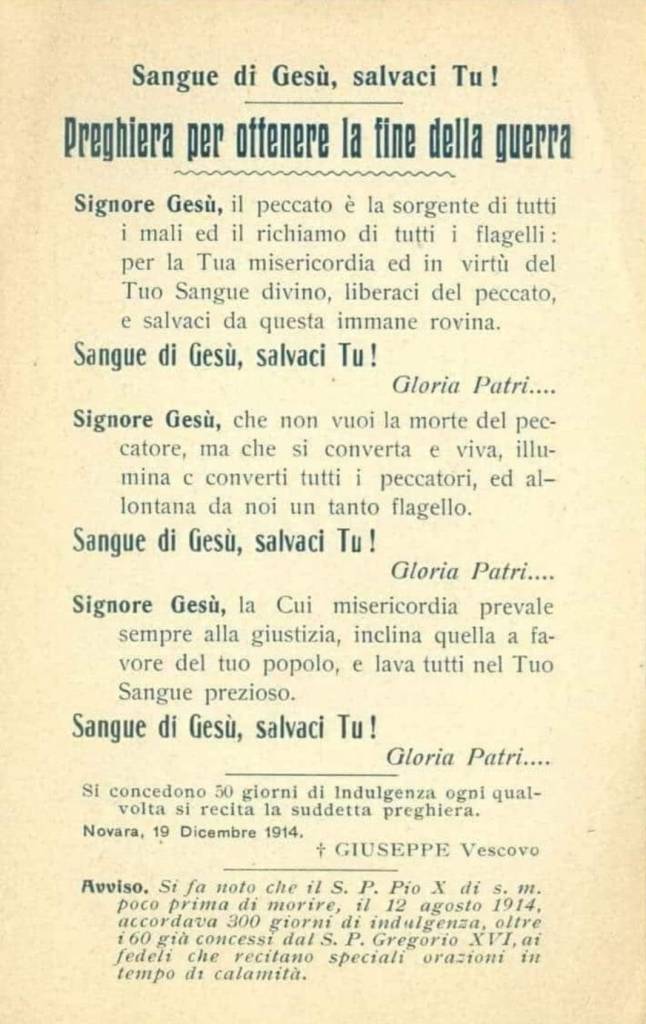 O Iddio Signore del cielo e della terra che forgiasti l’Uomo a tua immagine e somiglianza, non disdegnare l’implorazione e la supplica che Ti rivolgiamo nell’attesa del prosciugamento delle acque che hanno mondata l’Italia, e dalla ripresa dopo i terribili terremoti che sempre la scuotono devastandola;