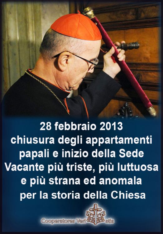 La Sede, quindi, non è vacante! E il terzo Segreto di Fatima deve ancora compiersi e cesserà con il trionfo del Cuore Immacolato di Maria. Non sappiamo come e quando, ma i tempi sono ristretti e forse c’è, in questa schizofrenia pastorale, una qualche ragione che noi non comprendiamo pienamente. In fondo ce la siamo anche meritata, abbiamo il Papa che ci meritiamo da quando abbiamo una chiesa “nuova” costruita come “vogliamo noi” e però, ricorda la beata Emmerick in una Visione di questi tempi di apostasia: “Dio aveva altri progetti”. E siamo certi che alla fine saranno questi a trionfare e di ciò che è stato del nostro tempo, non resterà pietra su pietra.