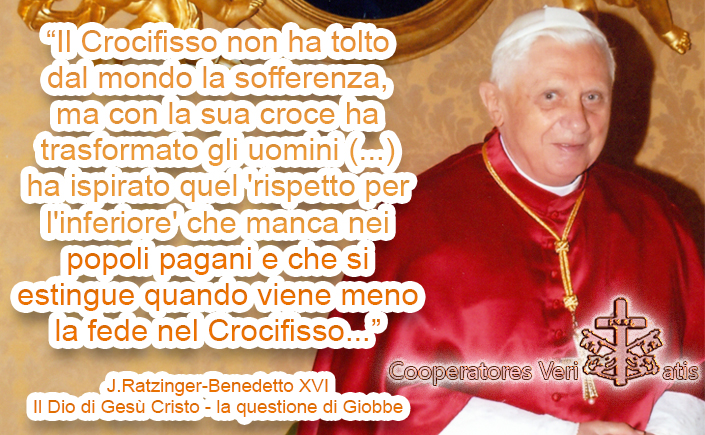 Non parliamo di consolazione. Questa esperienza, infatti, è l’origine dell’amore per coloro che soffrono. Ricordiamo soltanto i nomi di Francesco d’Assisi ed Elisabetta di Turingia. Il Crocifisso non ha tolto dal mondo la sofferenza, ma con la sua croce ha trasformato gli uomini, ha rivolto il loro cuore ai fratelli e alle sorelle che soffrono, e così ha rinvigorito e purificato gli uni e gli altri. È lui che ci ha ispirato quel ‘rispetto per l’inferiore’ che manca nei popoli pagani e che si estingue quando viene meno la fede nel Crocifisso.