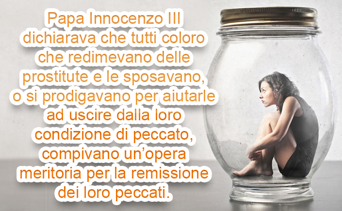 Con questi sentimenti e professando la fede nella Madre Chiesa che Gesù Cristo ci ha dato perché ci santificasse, e non per essere da noi “aggiornata” a seconda delle mode dei tempi, vi offriamo quanto segue che è uno spaccato su come la Chiesa trattasse, in passato, il problema della prostituzione. Vi accorgerete che, forse, è stata più “misericordiosa” in passato che oggi. A parte il compianto Don Oreste Benzi con la sua opera umanitaria atta a liberare le donne costrette alla prostituzione, non ci sembra oggi che le diocesi brillino di più di quanto brillasse la Chiesa in passato su questi atti di autentica misericordia.