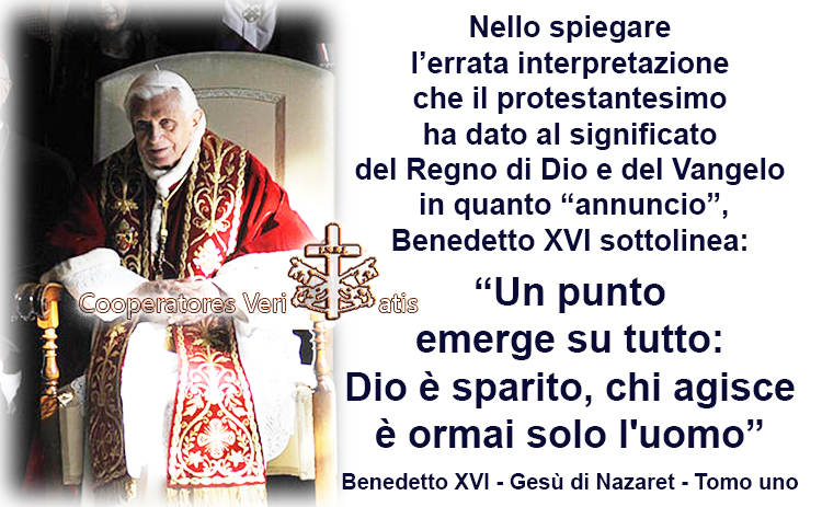 Ritorniamo dunque al Vangelo, ritorniamo all’autentico Gesù. La nostra critica principale a questa idea secolare-utopistica del regno era: Dio è scomparso. Non serve più o è addirittura di disturbo. Gesù però ha annunciato il regno di Dio, non un regno qualunque. È vero che Matteo parla di «regno dei cieli», ma la parola «cielo» è l’equivalente della parola «Dio» che il giudaismo, per rispetto del mistero di Dio, ha per lo più evitato, con riferimento al secondo comandamento. Di conseguenza con l’espressione «regno dei cieli» non viene annunciata una cosa che sta solo nell’aldilà, ma si parla di Dio che è tanto quaggiù quanto lassù – che trascende infinitamente il nostro mondo, ma è anche totalmente intimo a esso.