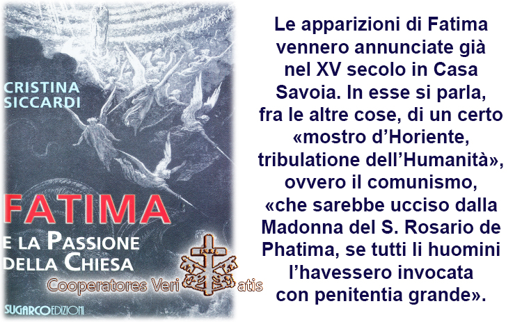 Le apparizioni di Fatima vennero annunciate già nel XV secolo in Casa Savoia, le cui profezie sono custodite nell’archivio di un monastero domenicano di Alba (CN). In esse si parla, fra le altre cose, di un certo « mostro d’Horiente, tribulatione dell’Humanità », ovvero il comunismo, « che sarebbe ucciso dalla Madonna del S. Rosario de Phatima, se tutti li huomini l’havessero invocata con penitentia grande ».