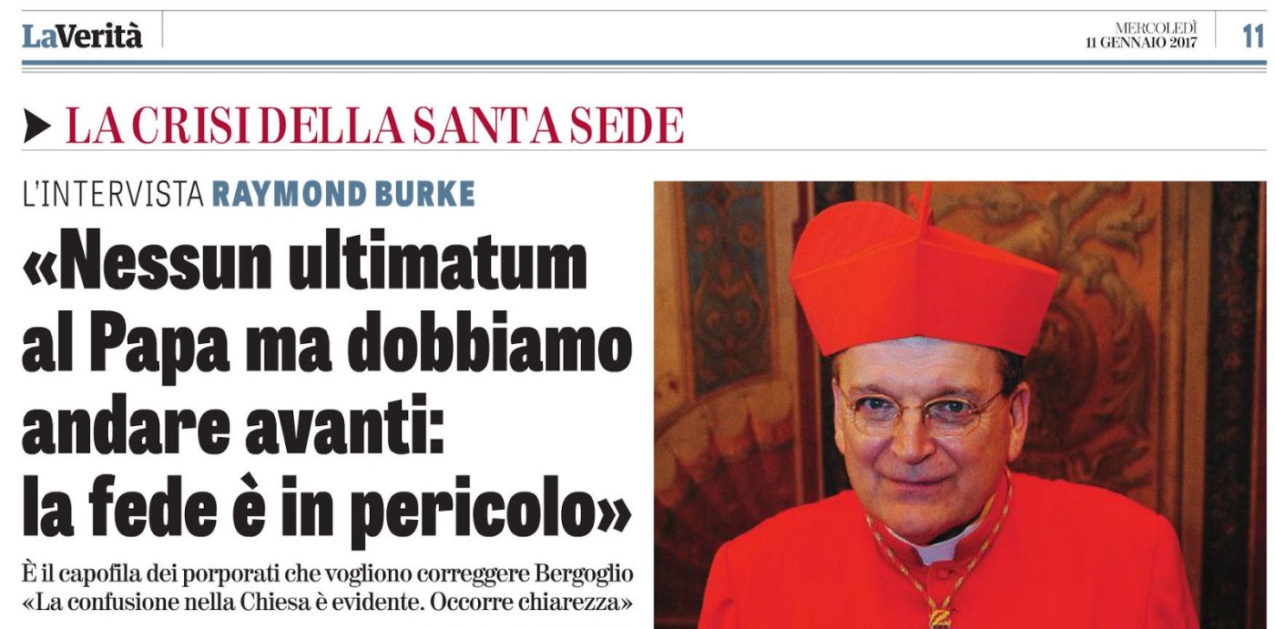 «La confusione nella Chiesa sull’interpretazione di alcuni passaggi di Amoris laetitia è evidente», dice invece a La Verità il cardinale Raymond Leo Burke, il più esposto dei quattro porporati, «per questo non vedo come si possa dire che non c’è pericolo per la fede. Inoltre noi abbiamo comunicato in modo molto rispettoso i cinque dubia al Papa e quando non ci è stata data risposta abbiamo deciso, per il bene delle anime, di rendere pubblico che ci sono dei dubbi e che tutti i fedeli sono chiamati a prestare attenzione».