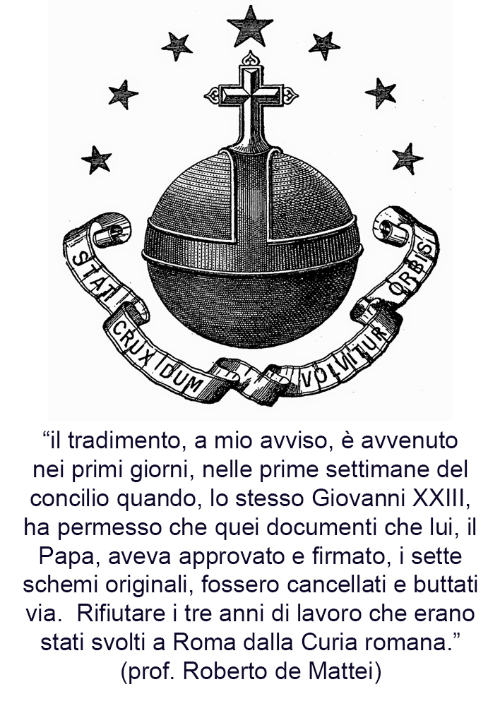 P.G. – Certo, nello spiegare la storia del Concilio lei ha detto che il primo e più importante tradimento fu causato da Giovanni XXIII, il quale permise ai sette schemi preparatori del Concilio, e a tutto il lavoro (ortodosso) in esso riversato, di venire scartati, pretendendo poi che il Concilio riuscisse a produrre un documento più ampio, per così dire, sul quale potesse votare la maggior parte dei Padri conciliari. Ma quei documenti vennero scritti in modo ambiguo e poco chiaro, tanto che il vescovo irlandese Morris – in seguito – affermò di averli firmati, e cito testualmente: “solo perché sapevo che erano stati scritti in modo poco preciso, e che avrebbero dovuti essere modificati in qualche modo, non mi preoccupai di votare a favore di essi perché ritenevo che non fossero né infallibili, né vincolanti per nessuno”.
