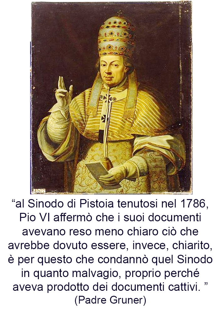 P.G. – Ovviamente un’altro aspetto più importante è far comprendere alle persone che non è vero un Concilio non può sbagliare, o che non possa essere, addirittura, malvagio. Si può spiegare il concetto di male come qualcosa che ci dovrebbe essere ma che non c’è. Non sono mie parole, ma insegnamenti di sant’Agostino e di san Tommaso. Un uomo che non vede, che è cieco, ha un male fisico, cioè gli manca la vista, un senso che dovrebbe avere in natura e che invece non ha. Ecco, in questo i documenti del Concilio rappresentano i suoi frutti, anche se non tutti, sicuramente i più importanti. Ebbene, se i documenti di un Concilio non sono chiari e possono essere interpretati in modi diversi, allora manca in essi la chiarezza che invece dovrebbero avere. Ad esempio, riguardo al Sinodo di Pistoia tenutosi nel 1786, Pio VI affermò che i suoi documenti avevano reso meno chiaro ciò che avrebbe dovuto essere chiarito invece, egli, è per questo che condannò quel Sinodo in quanto malvagio, proprio perché aveva prodotto dei documenti cattivi. Possiamo dire la stessa cosa anche in merito al Concilio Vaticano II?