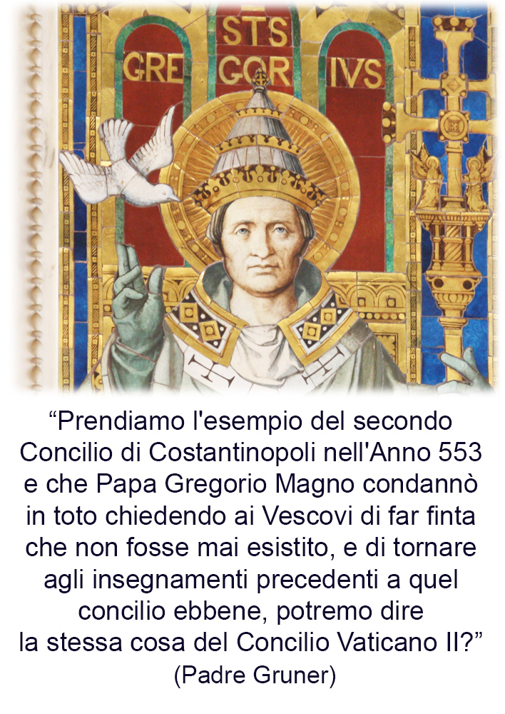 P.G. – Non sto parlando del tradimento dei documenti del Concilio, sto parlando del tradimento della Fede cattolica, della Chiesa Cattolica, la Chiesa di Cristo, dall’epoca della venuta di Nostro Signore e fino ai giorni nostri. Sto parlando del tradimento dello scopo stesso dell’Ufficio petrino e di quello dei Vescovi che è quello di promuovere, diffondere e difendere il Vangelo. Un Concilio dovrebbe fare la stessa cosa, ma se esso produce documenti ambigui o equivoci, il risultato è che essi possono essere interpretati nel modo sbagliato, proprio perché mancano di quella chiarezza – con gli stessi documenti – non permettendo quella chiarezza univoca. Quindi non è un tradimento del Concilio, ma è un tradimento della chiesa da parte di quel Concilio. Prendiamo l’esempio del secondo Concilio di Costantinopoli nell’Anno 553 e che Papa Gregorio Magno condannò in toto chiedendo ai Vescovi di far finta che non fosse mai esistito, e di tornare agli insegnamenti precedenti a quel concilio ebbene, potremo dire la stessa cosa del Concilio Vaticano II?
