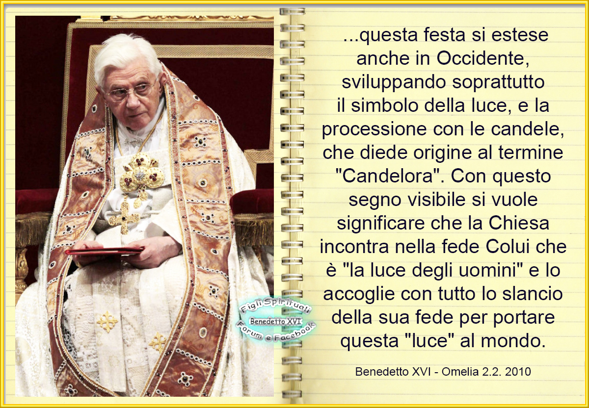 Nella festa della Presentazione di Gesù al Tempio celebriamo un mistero della vita di Cristo, legato al precetto della legge mosaica che prescriveva ai genitori, quaranta giorni dopo la nascita del primogenito, di salire al Tempio di Gerusalemme per offrire il loro figlio al Signore e per la purificazione rituale della madre (cfr Es 13,1-2.11-16; Lv 12,1-8). Anche Maria e Giuseppe compiono questo rito, offrendo – secondo la legge – una coppia di tortore o di colombi. Leggendo le cose più in profondità, comprendiamo che in quel momento è Dio stesso a presentare il suo Figlio Unigenito agli uomini, mediante le parole del vecchio Simeone e della profetessa Anna. Simeone, infatti, proclama Gesù come “salvezza” dell’umanità, come “luce” di tutti i popoli e “segno di contraddizione”, perché svelerà i pensieri dei cuori (cfr Lc 2,29-35). In Oriente questa festa veniva chiamata Hypapante, festa dell’incontro: infatti, Simeone ed Anna, che incontrano Gesù nel Tempio e riconoscono in Lui il Messia tanto atteso, rappresentano l’umanità che incontra il suo Signore nella Chiesa. Successivamente questa festa si estese anche in Occidente, sviluppando soprattutto il simbolo della luce, e la processione con le candele, che diede origine al termine “Candelora“. Con questo segno visibile si vuole significare che la Chiesa incontra nella fede Colui che è “la luce degli uomini” e lo accoglie con tutto lo slancio della sua fede per portare questa “luce” al mondo.