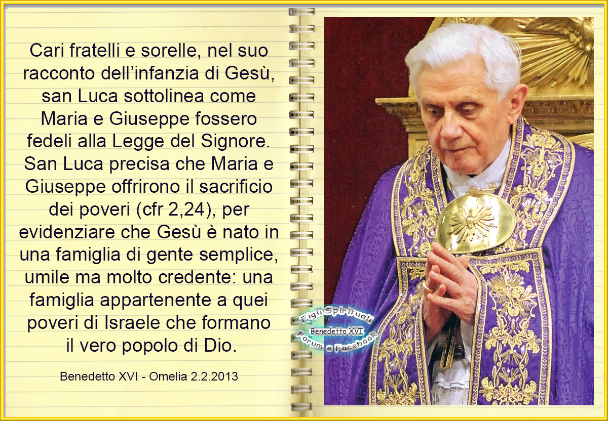 nel suo racconto dell’infanzia di Gesù, san Luca sottolinea come Maria e Giuseppe fossero fedeli alla Legge del Signore. Con profonda devozione compiono tutto ciò che è prescritto dopo il parto di un primogenito maschio. Si tratta di due prescrizioni molto antiche: una riguarda la madre e l’altra il bambino neonato. Per la donna è prescritto che si astenga per quaranta giorni dalle pratiche rituali, dopo di che offra un duplice sacrificio: un agnello in olocausto e una tortora o un colombo per il peccato; ma se la donna è povera, può offrire due tortore o due colombi (cfr Lv 12,1-8). San Luca precisa che Maria e Giuseppe offrirono il sacrificio dei poveri (cfr 2,24), per evidenziare che Gesù è nato in una famiglia di gente semplice, umile ma molto credente: una famiglia appartenente a quei poveri di Israele che formano il vero popolo di Dio. Per il primogenito maschio, che secondo la Legge di Mosè è proprietà di Dio, era invece prescritto il riscatto, stabilito nell’offerta di cinque sicli, da pagare ad un sacerdote in qualunque luogo. Ciò a perenne memoria del fatto che, al tempo dell’Esodo, Dio risparmiò i primogeniti degli ebrei (cfr Es 13,11-16).