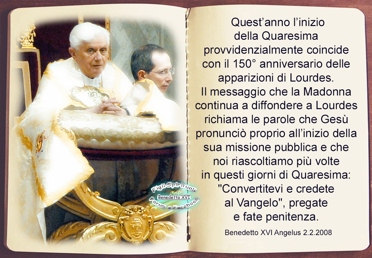 Quest’anno l’inizio della Quaresima provvidenzialmente coincide con il 150° anniversario delle apparizioni di Lourdes. Quattro anni dopo la proclamazione del dogma dell’Immacolata Concezione da parte del beato Pio IX, Maria si mostrò per la prima volta l’11 febbraio del 1858 a santa Bernadette Soubirous nella grotta di Massabielle. Seguirono altre successive apparizioni accompagnate da eventi straordinari, e alla fine la Vergine Santa si congedò rivelando alla giovane veggente, nel dialetto locale: “Io sono l’Immacolata Concezione”. Il messaggio che la Madonna continua a diffondere a Lourdes richiama le parole che Gesù pronunciò proprio all’inizio della sua missione pubblica e che noi riascoltiamo più volte in questi giorni di Quaresima: “Convertitevi e credete al Vangelo”, pregate e fate penitenza. Accogliamo l’invito di Maria che fa eco a quello di Cristo e chiediamoLe di ottenerci di “entrare” con fede nella Quaresima, per vivere questo tempo di grazia con gioia interiore e generoso impegno.