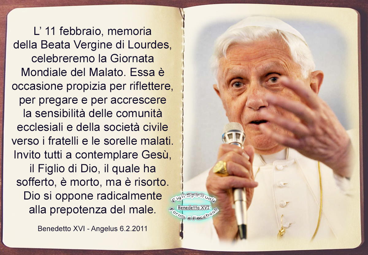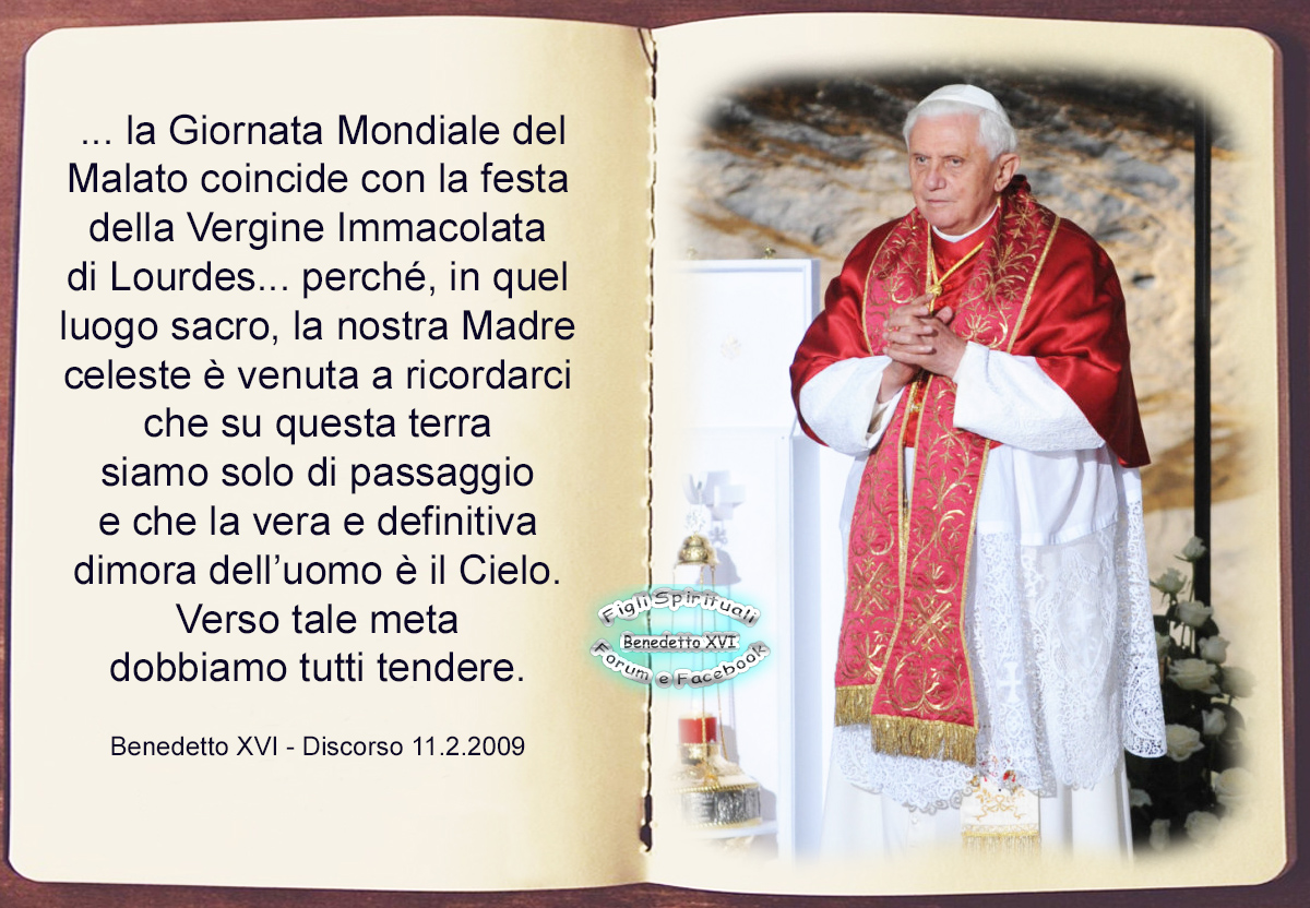 Il mio venerato e amato predecessore Giovanni Paolo II ha voluto che la Giornata Mondiale del Malato coincidesse con la festa della Vergine Immacolata di Lourdes. In quel luogo sacro, la nostra Madre celeste è venuta a ricordarci che su questa terra siamo solo di passaggio e che la vera e definitiva dimora dell’uomo è il Cielo. Verso tale meta dobbiamo tutti tendere. La luce che viene “dall’Alto” ci aiuti a comprendere e a dare senso e valore anche all’esperienza del soffrire e del morire. Domandiamo alla Madonna di volgere il suo sguardo materno su ogni ammalato e sulla sua famiglia, per aiutarli a portare con Cristo il peso della croce. Affidiamo a Lei, Madre dell’umanità, i poveri, i sofferenti, gli ammalati del mondo intero, con un pensiero speciale per i bambini sofferenti. Con questi sentimenti vi incoraggio a confidare sempre nel Signore e di cuore tutti vi benedico.