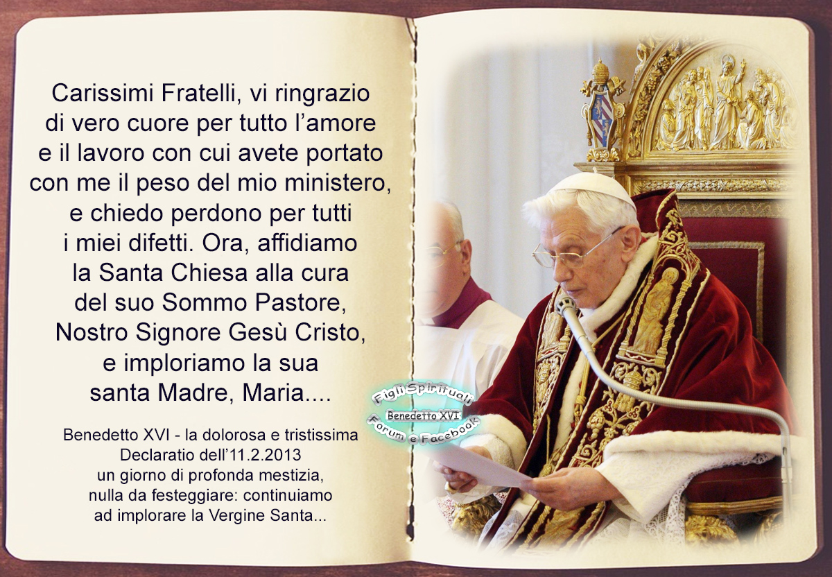 vi ho convocati a questo Concistoro non solo per le tre canonizzazioni, ma anche per comunicarvi una decisione di grande importanza per la vita della Chiesa. Dopo aver ripetutamente esaminato la mia coscienza davanti a Dio, sono pervenuto alla certezza che le mie forze, per l’età avanzata, non sono più adatte per esercitare in modo adeguato il ministero petrino. Sono ben consapevole che questo ministero, per la sua essenza spirituale, deve essere compiuto non solo con le opere e con le parole, ma non meno soffrendo e pregando. Tuttavia, nel mondo di oggi, soggetto a rapidi mutamenti e agitato da questioni di grande rilevanza per la vita della fede, per governare la barca di san Pietro e annunciare il Vangelo, è necessario anche il vigore sia del corpo, sia dell’animo, vigore che, negli ultimi mesi, in me è diminuito in modo tale da dover riconoscere la mia incapacità di amministrare bene il ministero a me affidato. Per questo, ben consapevole della gravità di questo atto, con piena libertà, dichiaro di rinunciare al ministero di Vescovo di Roma, Successore di San Pietro, a me affidato per mano dei Cardinali il 19 aprile 2005, in modo che, dal 28 febbraio 2013, alle ore 20,00, la sede di Roma, la sede di San Pietro, sarà vacante e dovrà essere convocato, da coloro a cui compete, il Conclave per l’elezione del nuovo Sommo Pontefice.