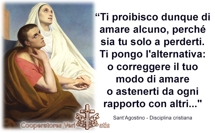 E non si dica che Sant’Agostino fosse un pelagiano, un rigido, un cattolico del “bianco o nero”, ecc… perché egli offre una alternativa: “Ti pongo l’alternativa: o correggere il tuo modo di amare o astenerti da ogni rapporto con altri…”, non ci sono “altre” alternative o a seconda del “caso per caso”. Inoltre qui Sant’Agostino sta parlando “a nome della Chiesa”, infatti dice: “Ti invito a esaminarti mentre qui ora, in questa scuola di vita cristiana, tu mi ascolti e anzi attraverso me ascolti Dio…”