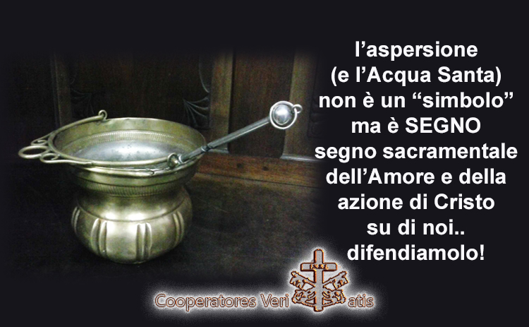 Supplichiamo Sacerdoti e Vescovi a riscoprire il Rito dell’Aspersione per i Fedeli tutti, questo sì che è un nostro diritto, altro che la pretesa di voler ricevere l’Eucaristia nello stato di peccato! Questo è il dovere dei Sacerdoti e Vescovi, aspergere il Popolo di Dio, affinché sia purificato, fortificato e protetto in questa battaglia contro le minacce dei demoni. I Sacerdoti e i Vescovi devono servire i Fedeli insegnando loro l’uso dell’Acqua Benedetta e di portarla nelle proprie case, che da quando ciò non si fa più, Famiglie intere hanno subìto le angherie dei demoni senza accorgersene. Non si può privare il Popolo di Dio di un dono così grande.