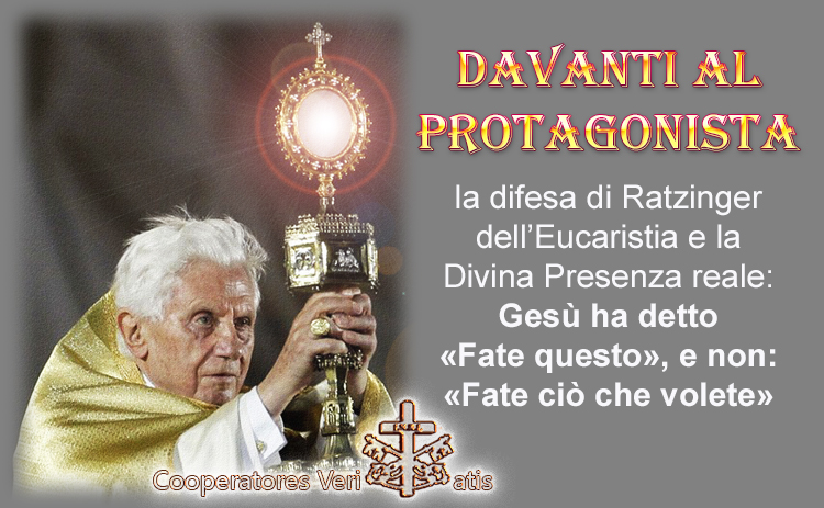 “.. a me interessa propriamente la legittimità del passaggio dalla Cena alla Messa, da Gesù all’Eucaristia della Chiesa e così mi interessa lo iato, caratterizzante la visione della teologia moderna, tra Gesù e la Chiesa e quindi in generale la natura dello sviluppo della Tradizione e della Chiesa. Malgrado questa differenza nell’approccio al problema, mi sembra tanto più importante l’unità di base nel risultato. D’ora innanzi non dovrebbe più essere possibile parlare semplicemente della «struttura di convito» dell’Eucaristia, la cui affermazione si basa su un malinteso circa l’evento istitutivo e conduce ad un fraintendimento del Sacramento in genere.