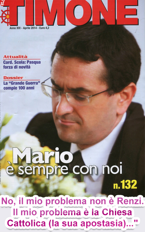 Come conclusione, ricordando oggi l’Anniversario a tre anni dalla morte dell’amico in Cristo, Mario Palmaro, vogliamo offrirvi alcune sue riflessioni che oseremo dire profetiche. Prima vi ricordiamo una sua Lettera al Direttore de La Nuova Bussola Quotidiana del gennaio 2014, e già minato dalla malattia, Palmaro scriveva e denunciava: “Capisci, caro direttore? Fra poco prenderanno mio figlio di sette anni e a scuola lo metteranno a giocare con i preservativi e i suoi genitali, e la Chiesa di che cosa mi parla? Dei barconi che affondano a Lampedusa, di Gesù che era un profugo, di un oscuro gesuita del ‘600 appena beatificato. No, il mio problema non è Matteo Renzi. Il mio problema è la Chiesa Cattolica (la sua apostasia)…“, clicca qui testo integrale.