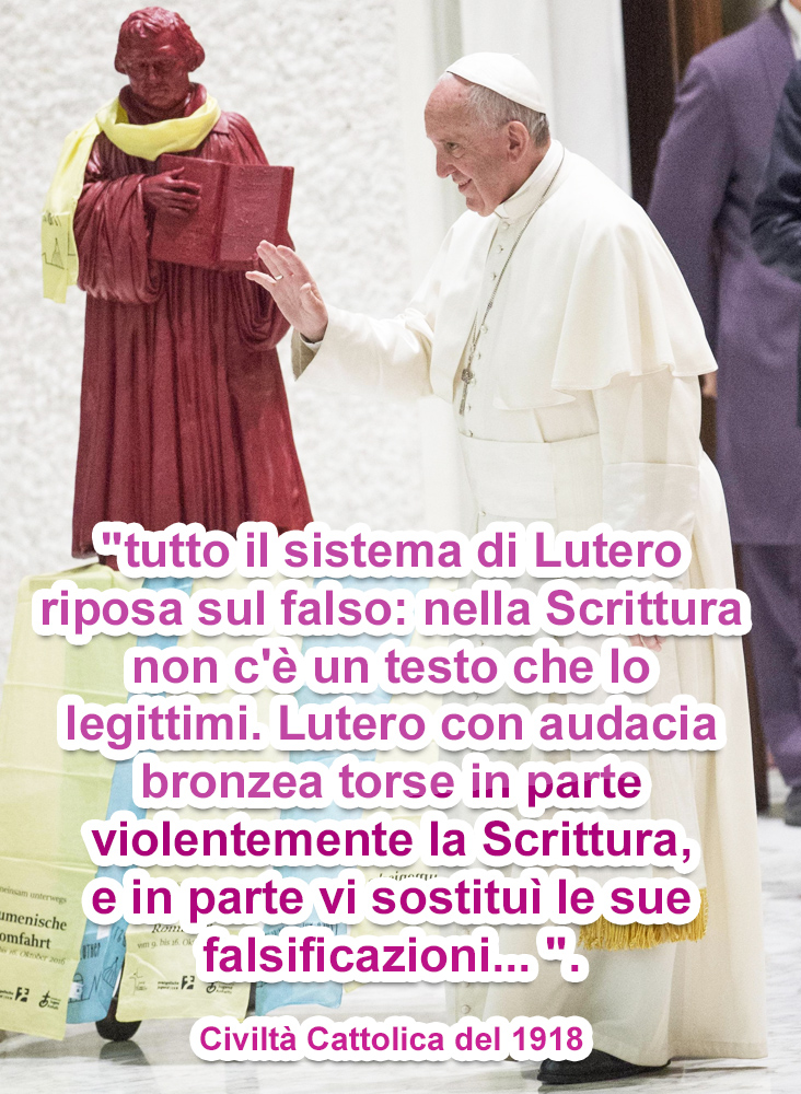 Scriveva la Civiltà Cattolica nel 1918, quando era ancora cattolica, vedi qui testo originale – “tutto il sistema di Lutero riposa sul falso: nella Scrittura non c’è un testo che lo legittimi. Lutero con audacia bronzea torse in parte violentemente la Scrittura, e in parte vi sostituì le sue falsificazioni… “.