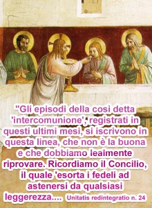 E attenzione, qui il Concilio Vaticano II non c’azzecca nulla! Qui siamo oltre, siamo forse ad un Vaticano III senza accorgercene? Il secondo infatti ammoniva: “Gli episodi della così detta ‘intercomunione’, registrati in questi ultimi mesi, si iscrivono in questa linea, che non è la buona e che dobbiamo lealmente riprovare. Ricordiamo il Concilio, il quale ‘esorta i fedeli ad astenersi da qualsiasi leggerezza o zelo imprudente, che potrebbero nuocere al vero progresso dell’unità’ (Unitatis redintegratio n. 24)”.