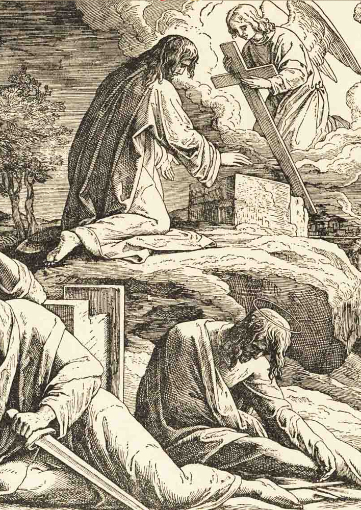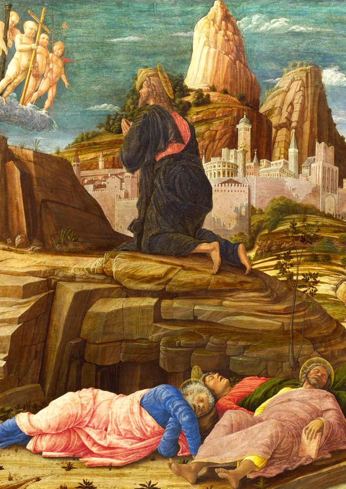 Dopo la rituale recita in comune dei Salmi, Gesù prega da solo – come durante tante notti in precedenza. Lascia, tuttavia, vicino a sé il gruppo dei tre – noto da altri contesti e in particolare dal racconto della trasfigurazione: Pietro, Giacomo e Giovanni. Così questi, anche se ripetutamente sopraffatti dal sonno, diventano testimoni della sua lotta notturna. Marco ci racconta che Gesù comincia a «sentire paura e angoscia». Il Signore dice ai discepoli: «La mia anima è triste fino alla morte. Restate qui e vegliate!» (14,33s).
