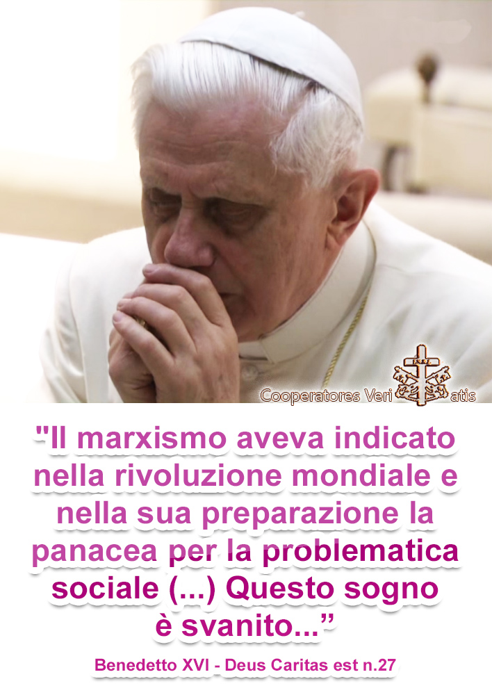 Nella sua prima enciclica Deus Caritas est, così spiegava Benedetto XVI: “Il marxismo aveva indicato nella rivoluzione mondiale e nella sua preparazione la panacea per la problematica sociale: attraverso la rivoluzione e la conseguente collettivizzazione dei mezzi di produzione — si asseriva in tale dottrina — doveva improvvisamente andare tutto in modo diverso e migliore. Questo sogno è svanito…” (n.27)