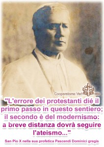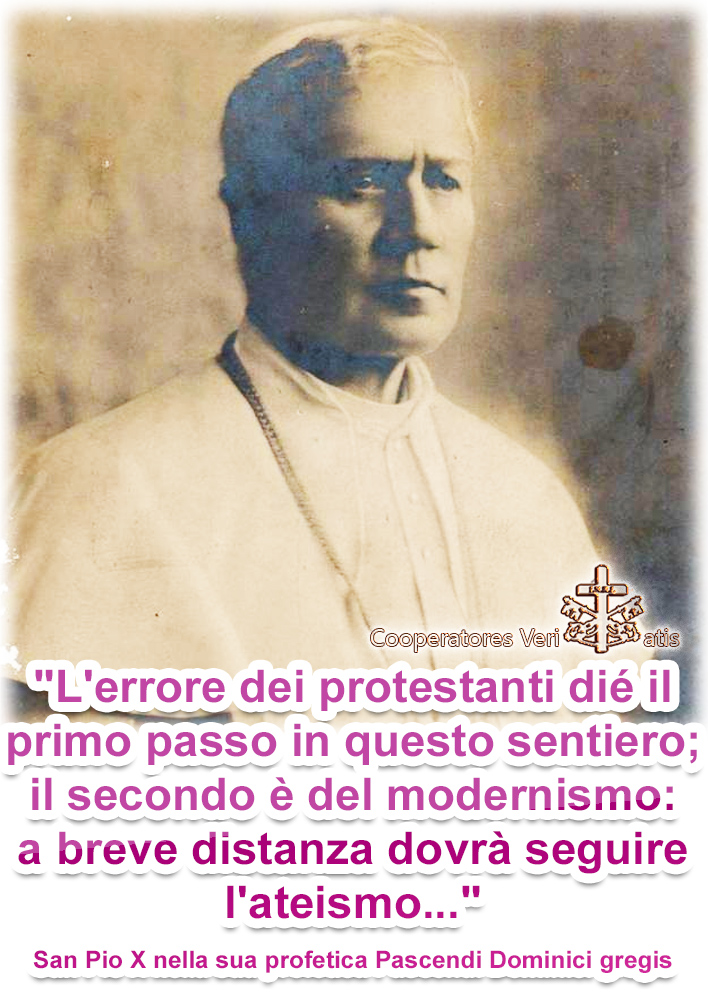 Spiegava San Pio X nella sua profetica Pascendi Dominici gregis: “Vedremo più oltre come, con siffatte teorie, congiunte agli altri errori già mentovati, si spalanchi la via all’ateismo (..) resta di nuovo o l’ateismo o l’irreligione assoluta…” e profetizzava: