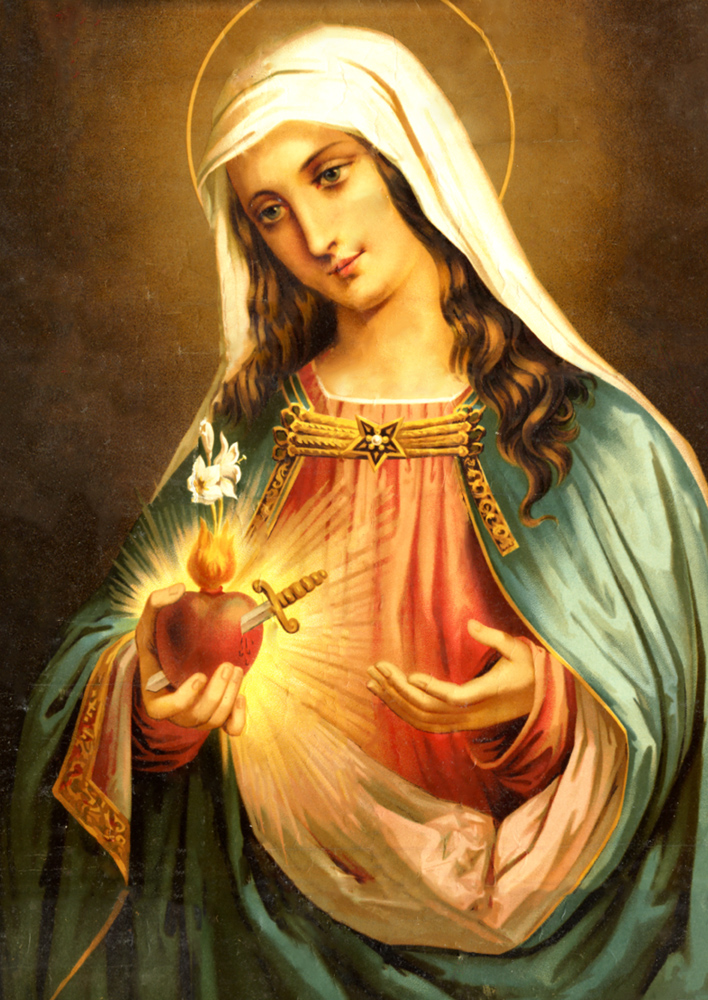 Se ci fermiamo a contemplare le immagini – tratte dalle parole – che ritraggono il Cuore di Maria, vediamo che esso è circondato da una corona di rose, di fiori che significano la sua purezza, l’immacolatezza, la fragranza di una natura incorrotta, e da una spada che significa i dolori di Maria, quelli profetizzati da Simeone durante la Presentazione di Gesù Bambino al Tempio: «Egli (Gesù) è qui per la rovina e la risurrezione di molti in Israele, segno di contraddizione perché siano svelati i pensieri di molti cuori. E anche a te una spada trafiggerà l’anima»(Lc.2,34-35).