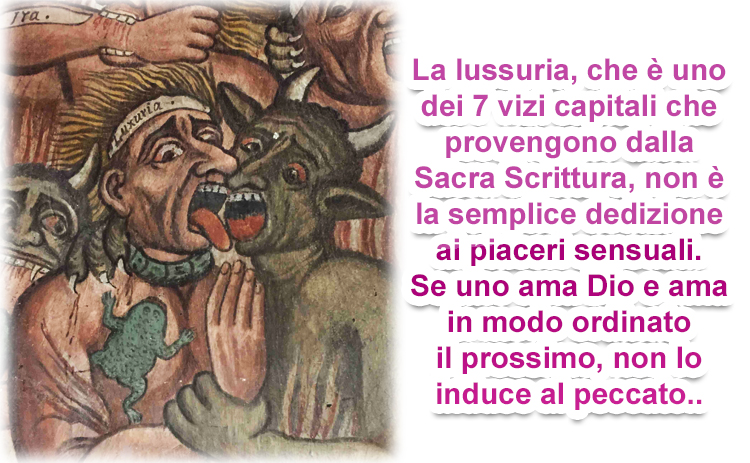 La lussuria, che è uno dei 7 vizi capitali che sono ben descritti e condannati dalla Sacra Scrittura, non è la semplice dedizione ai piaceri sensuali. “Alcuni peccati – spiega il domenicano Padre Angelo – che degenerano in vizi perché si esprimono con frequenti cadute, vengono detti capitali perché sono come la madre, la generatrice, la sorgente di altri peccati e vizi. Scrive San Tommaso: “Capitale deriva da capo. E capo propriamente è quella parte dell’animale che è principio ed elemento direttivo di tutto l’animale. Perciò in senso metaforico si denomina capo qualsiasi principio: anzi, si denominano capi persino gli uomini che dirigono e governano gli altri. Quindi vizio capitale deriva … in senso metaforico dal termine capo, cioè nel senso di principio e trascinatore di altri. E allora vizio capitale non solo è principio di altri, ma ne è pure la guida e in qualche modo il trascinatore… Ecco perché S. Gregorio paragona i vizi capitali ai comandanti di un esercito” (Somma teologica, I-II, 84, 3)… Alcuni vi aggiungono la superbia, che viene definita da San Tommaso la regina e inizio di ogni peccato. Infatti la superbia, che è uno disordinato desiderio di primeggiare, è all’inizio di ogni peccato.”