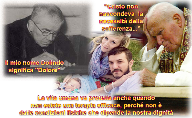 Che cosa hanno in comune queste due Anime e la famosa enciclica di Giovanni Paolo II, la Salvifici doloris? Certamente sono due casi completamente diversi, eppure condividono una similitudine che faremo bene a meditare: in Don Dolindo Ruotolo, nonostante la grettezza dei suoi genitori, la ruvidezza dei comportamenti di un padre autoritario e manesco, prevale quel senso della vita che era la nostra cultura di un tempo, il valore che si dava alla sofferenza e di conseguenza il valore che si dava alla vita umana, a prescindere da…. Nel caso di Charlie, pur emergendo l’amore di due genitori pronti a fare ogni sacrificio per il loro unico figlio, alla fine prevale quel senso di scoraggiamento che è la “cultura della morte” non in quanto essa sia un fattore del tutto naturale nel momento in cui nasce una vita, ma una “cultura” ingannatrice atta a capovolgere il senso stesso della vita e del suo valore a prescindere dal fatto, appunto, se uno nasce “malato” o meno.
