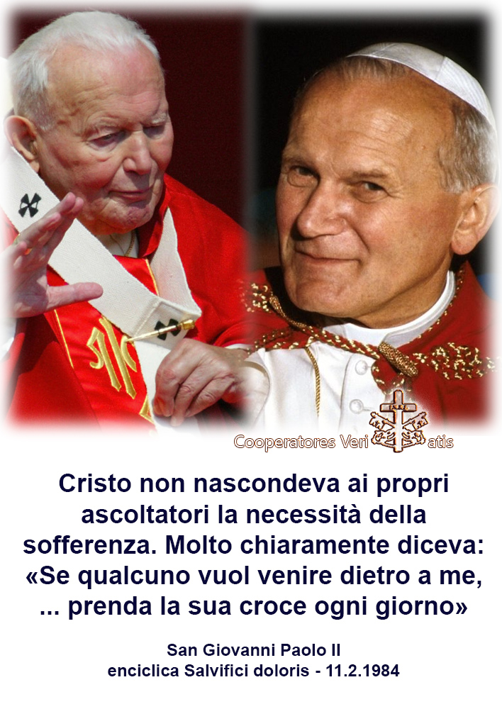 “Cristo si è avvicinato soprattutto al mondo dell’umana sofferenza per il fatto di aver assunto egli stesso questa sofferenza su di se’. Durante la sua attività pubblica provò non solo la fatica, la mancanza di una casa, l’incomprensione persino da parte dei più vicini, ma, più di ogni cosa, venne sempre più ermeticamente circondato da un cerchio di ostilità e divennero sempre più chiari i preparativi per toglierlo di mezzo dai viventi. Cristo è consapevole di ciò, e molte volte parla ai suoi discepoli delle sofferenze e della morte che lo attendono.. (..) perciò Cristo rimprovera severamente Pietro, quando vuole fargli abbandonare i pensieri sulla sofferenza e sulla morte di Croce… (..) Il motivo della sofferenza e della gloria ha la sua caratteristica strettamente evangelica, che si chiarisce mediante il riferimento alla Croce ed alla risurrezione. La risurrezione è diventata prima di tutto la manifestazione della gloria, che corrisponde all’elevazione di Cristo per mezzo della Croce. Se, infatti, la Croce è stata agli occhi degli uomini lo spogliamento di Cristo, nello stesso tempo essa è stata agli occhi di Dio la sua elevazione. Sulla Croce Cristo ha raggiunto e realizzato in tutta pienezza la sua missione: compiendo la volontà del Padre, realizzò insieme se stesso. Nella debolezza manifestò la sua potenza, e nell’umiliazione tutta la sua grandezza messianica. Non sono forse una prova di questa grandezza tutte le parole pronunciate durante l’agonia sul Golgota e, specialmente, quelle riguardanti gli autori della crocifissione: «Padre, perdonali, perché non sanno quello che fanno»? A coloro che sono partecipi delle sofferenze di Cristo queste parole si impongono con la forza di un supremo esempio. La sofferenza è anche una chiamata a manifestare la grandezza morale dell’uomo, la sua maturità spirituale…”
