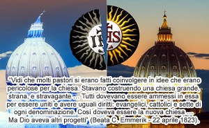 Non dimentichiamo la profezia della beata Caterina Emmerich: “Vidi che molti pastori si erano fatti coinvolgere in idee che erano pericolose per la chiesa. Stavano costruendo una chiesa grande, strana e stravagante… Tutti dovevano essere ammessi in essa per essere uniti e avere uguali diritti, cattolici e sette di ogni denominazione. Così doveva essere la nuova chiesa… Ma Dio aveva altri progetti” (22 aprile 1823)