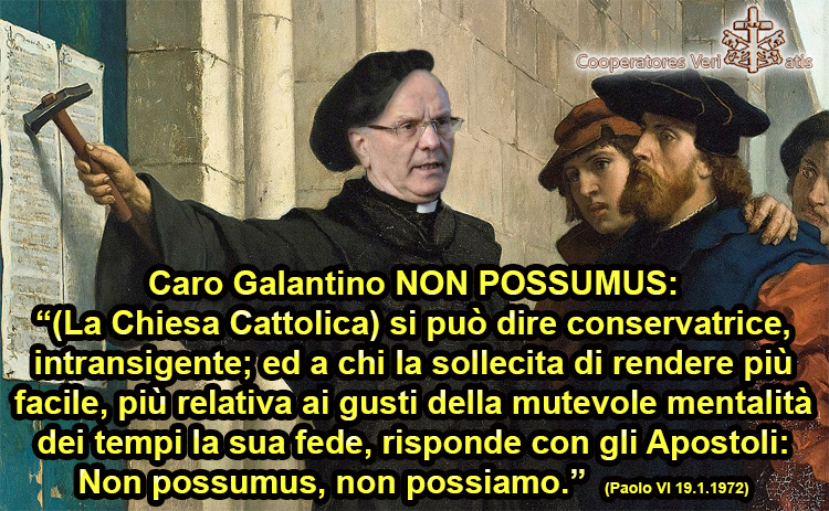 Le affermazioni profane e sacrileghe di Galantino ci riportano così a quel “pecca fortiter”…. non a caso infatti, questa chiesa di oggi filtra, senza affermazioni dottrinali ma solo pastorali (sic!) una certa compiacenza con l’uomo peccatore, ossia con il suo peccare senza spingerlo alla conversione: “pecca uomo, pecca fin che puoi – sembrano dire questi pastori – tanto Dio è misericordioso! Lo Spirito Santo ha illuminato Lutero…” e così vorrebbero salvare capre e cavoli, avere la botte piena e la moglie ubriaca.