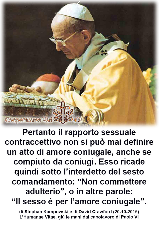 La contraccezione DEFORMA IL VERO senso della libertà umana, influisce diabolicamente sul suo pensiero UCCIDENDO IL FUTURO. ADULTERIO SIGNIFICA “FALSIFICARE”…. mentre la maggior parte della gente quando sente questo termine pensa solo al sesso…. e poi vengono a dire che è la santa e vera Chiesa di Cristo a “castrare” il pensiero degli uomini! Ma per favore!! Il sesso è uno STRUMENTO gestito e dettato dalle “Norme morali divine”, chiunque le calpesti, con qualunque mezzo contraccettivo, ADULTERA LA MISSIONE DEGLI SPOSI e ne falsifica il Matrimonio, falsifica l’unione, falsifica il proprio futuro impedendo a nuove vite umane di nascere.