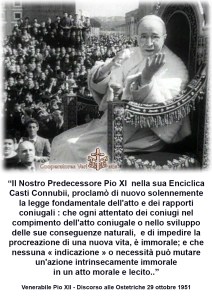 “Il Nostro Predecessore Pio XI di felice memoria nella sua Enciclica Casti Connbii del 31 dicembre 1930 proclamò di nuovo solennemente la legge fondamentale dell’atto e dei rapporti coniugali : che ogni attentato dei coniugi nel compimento dell’atto coniugale o nello sviluppo delle sue conseguenze naturali, attentato avente per scopo di privarlo della forza ad esso inerente e di impedire la procreazione di una nuova vita, è immorale; e che nessuna « indicazione » o necessità può mutare un’azione intrinsecamente immorale in un atto morale e lecito ( cfr. Acta Ap. Sedis vol 22, p. 559 e segg.).”