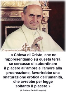 – «Noi portiamo il peso dell’umanità presente e futura. Bisogna pur comprendere che, se l’uomo accetta di dissociare nell’amore il piacere dalla procreazione (e certamente oggi lo si può dissociare facilmente), se dunque si può prendere a parte il piacere, come si prende una tazza di caffè, se la donna sistemando un apparecchio o prendendo ‘una medicina’ diventa per l’uomo un oggetto, uno strumento, al di fuori della spontaneità, delle tenerezze e delle delicatezze dell’amore, allora non si comprende perché questo modo di procedere (consentito nel matrimonio) sia proibito fuori dal matrimonio. La Chiesa di Cristo, che noi rappresentiamo su questa terra, se cessasse di subordinare il piacere all’amore e l’amore alla procreazione, favorirebbe una snaturazione erotica dell’umanità, che avrebbe per legge soltanto il piacere.»