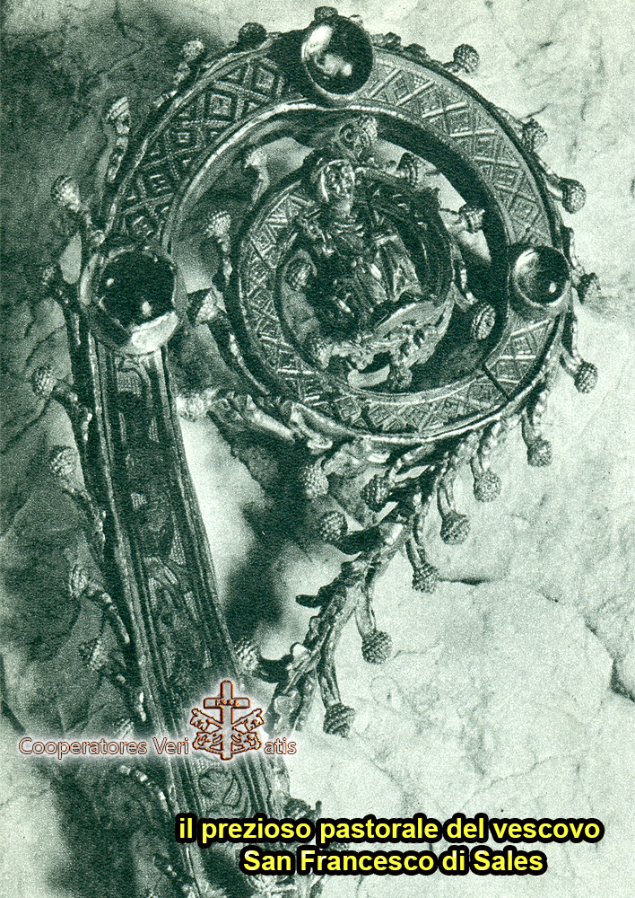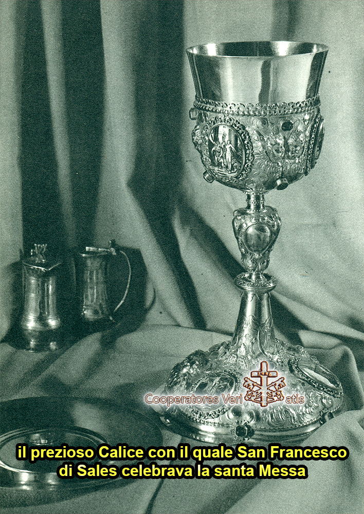 Questo è il programma di San Francesco di Sales nei suoi vent’anni da Vescovo, un vescovo sempre in mezzo al proprio popolo di giorno, in cattedrale per confessare, la notte per pregare. In questi vent’anni il suo modello di Vescovo sarà appunto San Carlo Borromeo e, come lui, si batterà senza mai risparmiarsi per affermare la vera Riforma voluta da Trento. Il suo stesso tenore di vita sarà frugale e semplice, un vero povero di risorse personali, ma PRODIGO NELLE VESTIGIA DELL’ALTARE E DEI RITI COME NEGLI ABITI LITURGICI. Ama pasti semplici e frugali, gli abiti personali sono gli stessi ma puliti e ricamati per nascondere le toppe… non tiene carrozze e cavalli, ma non disprezza quando qualcuno glieli presta per spostarsi, osserva per se stesso disciplina e digiuno, spesso anche con l’uso del cilicio. Ma non vuole neppure sminuire, o impoverire l’immagine del Vescovo che ben sa non appartenergli ma che gli è stato affidato tal mandato, perciò quando si presenta da Vescovo nelle occasioni ufficiali e di predicazione, riserva un protocollo molto suggestivo e di “pompa magna”, mentre nella quotidianità conserverà sempre una indispensabile immagine del Vescovo, anche se meno rigorosa nel protocollo. Altro massimo rigore d’immagine riserva al Santissimo Sacramento ed alla Messa al quale destina tutti gli ori e argenti disponibili, vasi preziosi, abiti liturgici ricamati e sempre puliti, candele ed oli persino profumati. Ha il gusto della “bella Liturgia” a tal punto che spesso lo si vede commosso e con le lacrime agli occhi durante la Messa.