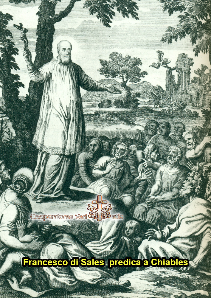 Meditiamo! Mediatiamo! I protestanti ricattano, perseguitano, minacciano, impongono, depredano le chiese, le profanano, compiono sacrilegi, si scagliano COME ANIMALI SULLE PREDE INERMI, questo è il bollettino descritto da un Santo, di una guerra avviata e dichiarata da Lutero prima e da Calvino continuata, portata alle estreme conseguenze, contro la Chiesa Cattolica, contro i Santi, fatti a pezzi in tutte le chiese ove venivano venerati. Questa è la situazione che trova e descrive uno dei più grandi Santi della Chiesa. Giunge così a Thonon, inviato in missione apostolica, dove vuole insediarsi presto per prendere i contatti con i Protestanti, Francesco di Sales infatti non li teme, al contrario, la sua battaglia è contro gli spiriti che accecano queste persone che non vuole si dannino, ma lotta per la loro conversione e salvezza.