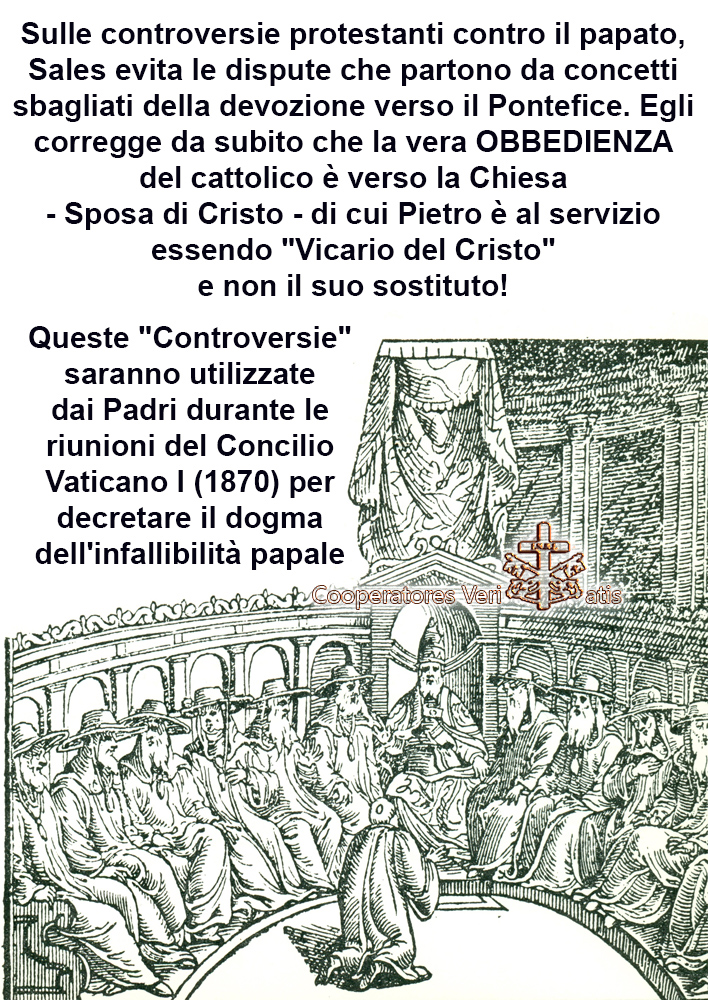 Sulle controversie protestanti contro il papato, Sales evita le dispute che partono da concetti sbagliati della devozione verso il Pontefice. Egli corregge da subito che la vera OBBEDIENZA del cattolico è verso la Chiesa – Sposa di Cristo – di cui Pietro è al servizio essendo “Vicario del Cristo” e non il suo sostituto! Sales sostiene che l’eresia protestante parte da una FALSIFICAZIONE della dottrina sul papato e di conseguenza non è sulla loro eresia che bisogna discutere “ch’è perdita di tempo, frustrazione ed inganno“, ma insistere sulla vera dottrina del primato petrino sotto il quale lo stesso Pontefice è soggetto! Anche il Papa deve obbedire alle dottrine della Chiesa, ne è il garante e custode per mezzo di una grazia speciale data solo a Pietro e per questo è “infallibile”, ma deve anch’egli essere istruito nella sana dottrina di cui poi deve essere il garante. Una particolarità deve essere sottolineata: in tutte le sue dispute con i protestanti Sales NON difenderà mai il Sommo Pontefice dagli attacchi alla sua persona, indirizzerà ogni catechesi AL LEGITTIMO PRIMATO PETRINO, alla legittima Santa Sede onde evitare che le discussioni finiscano in una visione errata del ruolo petrino offrendo piuttosto – ai protestanti – l’occasione di accusarlo di “idolatria verso il papa come un culto alla persona”.